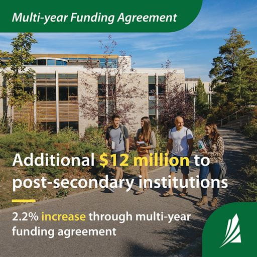 The additional funding is being provided through an amendment to the current multi-year funding agreement between government and post-secondary education institutions. The four-year timeframe has provided greater funding certainty, paving the way for institutions to improve long-term financial sustainability, support growth and ensure students are well-supported. The 2024-25 budget represents the fourth and final year of the current agreement, which was the first of its kind in the post-secondary sector.
