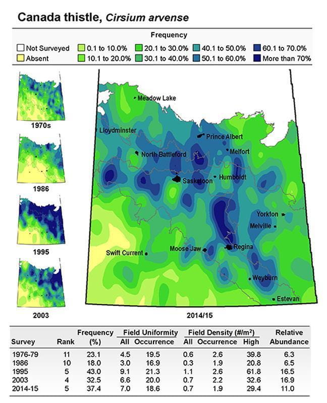 While Canada thistle is capable of inhabiting most of Saskatchewan, including the northern forest regions, it is best adapted to the high moisture crop production areas. In the 2014/15 Saskatchewan Weed Survey Canada thistle ranked fourth overall in relative abundance, remaining in the top 5 since the 1995 survey.