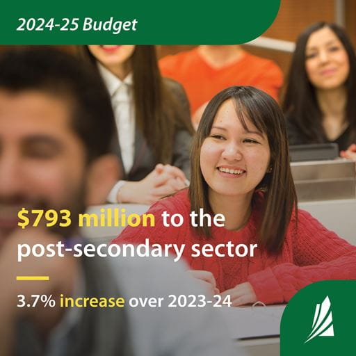 In 2024-25, the Government of Saskatchewan is investing $793 million in the province's post-secondary sector, representing a 3.7 per cent increase from the previous year. This year's budget provides for increased funding within the multi-year agreement, health training programs and seat expansions, and capital for key infrastructure projects.