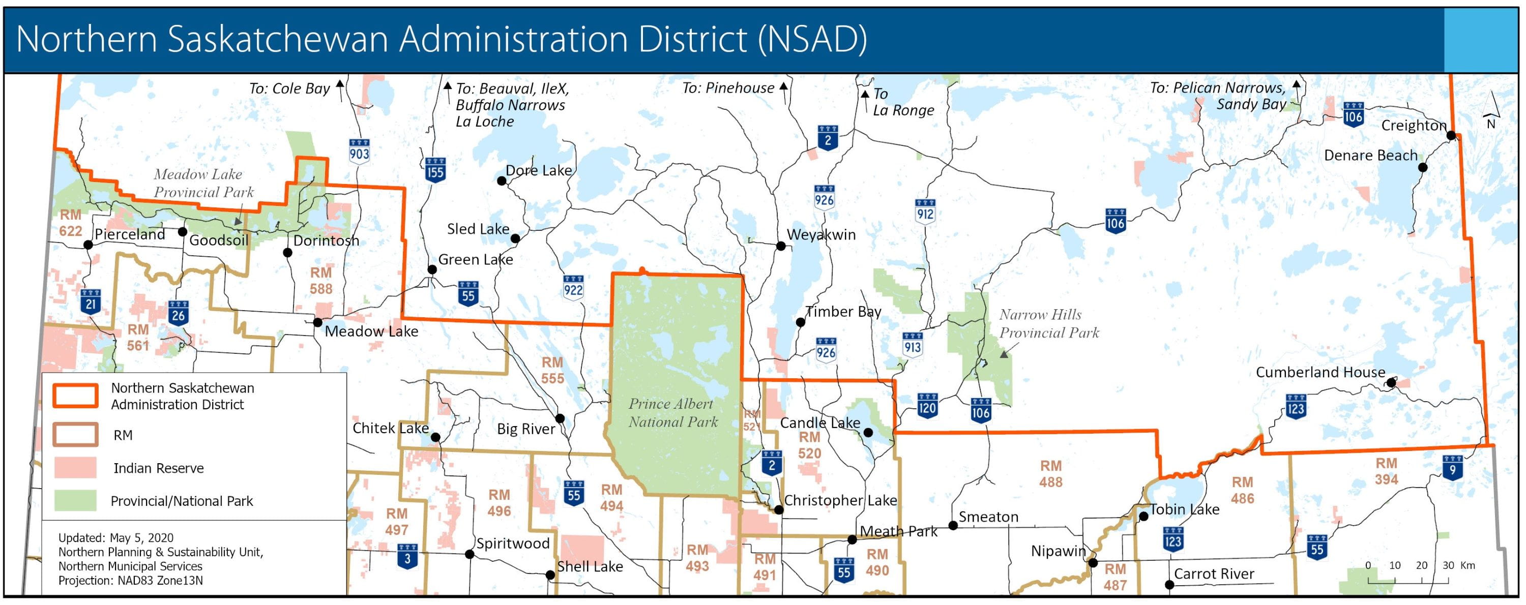 The Northern Saskatchewan Administration District (NSAD) is defined in the province's Northern Municipalities Act, 2010. This area's creation dates back to The Northern Administration Act, 1948, which provided for the administration and development of the northern part of Saskatchewan.